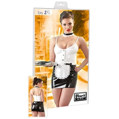 Close-fitting patent mini dress with adjustable straps, back with zip and press stud, front with press studs. The apron is sewn on. Includes collar with press stud fastening. Black/White 100% polyester with polyurethane coating.