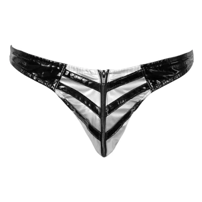 Two-tone vinyl briefs Pouch in a stripe design Zip at the front Stretchy waistband and leg seams