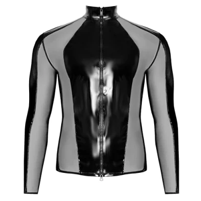 Long-sleeved shirt made of glossy vinyl Transparent mesh inserts Full-length 2-way front zip Very comfortable to wear