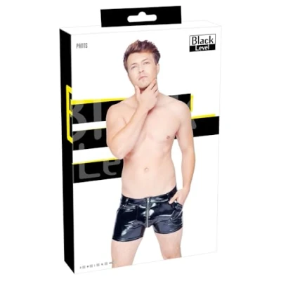 Pants made out of 4-way stretchy vinyl With a padded zip at the front With pockets at the sides Tight-fitting – very comfortable