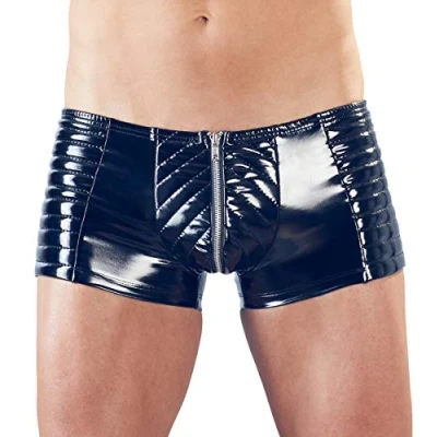 With a metal zipper in the front Made of glossy vinyl with a distinctive topstitching A tight-fitting biker-style pant
