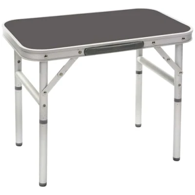 Compact and robust aluminium table with 2 heights: 45 / 23 cm Adjusting screws for uneven floors. With carry handle and compact to store thanks to removable legs Table top: 56 x 34 cm. Packed dimensions: 56 x 34.5 x 3.5 cm Weight: approx. 1.8 kg Colour: black