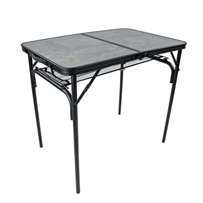 Stylish aluminium table with industrial look and concrete look table top. Additional fine adjustment thanks to the adjusting screws Compact to store as a suitcase model thanks to removable legs and a separable plate. Includes handy net under the table for storing items. With practical carry handle