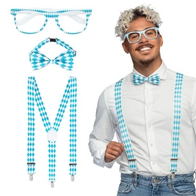 You will receive a multi-piece costume set from the brand. Boland The set includes braces, party glasses and a bow tie All accessories are in blue and white and printed with a diamond pattern Celebrate a hearty beer festival or a Bavarian evening with this costume accessory Combined with a hat or traditional trousers (not included) from Boland, your party outfit will be complete, Manufacturer: Boland