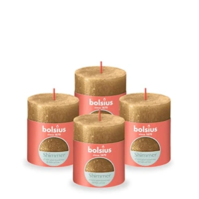 Add a little shimmer and shine to your interior! Not only for festive moments, but all year round. Bolsius rustic candles Shimmer Gold features a sparkling gold tone with an extra glittering, metallic finish. The light boasts a height of 8 cm and burns for just about 35 hours. Made without palm oil, using vegan wax - with love for people and planet. Add some sparkle to the atmosphere of your home! * Longer Burning Time * With Natural Vegan Wax * Without Palm Oil * Without Animal Grease * Metallic Finish * Perfect flame up to 35h * Burns clean Make every moment a special moment! The light natural light of lights adds a unique warmth and atmosphere to your home. Bolsius Rustic Light Shimmer features a glittering, metallic finish and snuggles or tears. Made with natural vegan wax and without palm oil - with love for people and planet. The cotton wick is woven in such a way that your flame remains stable. So no black smoke or soot coatings occur during burning. Glittering gold makes everything more stylish! This gold tone with metallic finish ensures a trendy and stylish touch. You can mix and match with any other color of Bolsius collection of rustic lights. Bolsius collection Shimmer adds a little shimmer and shine to your interior! These rustic lights are available in 9 trendy colours and have a shimmering metallic shine. Available in 2 different sizes. Inspired by textures and shades of nature and made with love for people and planet. Without palm oil and animal fat, but with natural, vegan wax from olive oil, sunflower oil or rapeseed oil. Let your home glitter!