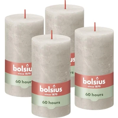 Make every moment a special one! The natural light of candles brings a unique warmth and ambience into your home and makes it cosy. Bolsius's rustic pillar candle coming in the 21 Sandy Grey tone Sandy Grey boasts a full 13cm in height and burns for a good 60 hours. Made without palm oil, using natural vegan wax - with love for people and planet. Sandy Grey is a soft, 21 Sandy Grey color from nature and is a nice neutral color. Think of a sandy beach in summer! The perfect base tone that goes well with everything. Bolsius quality rustic candles are available in different sizes and come in an array of 23 different colors. The collection has been inspired by the textures and colors of nature. Made without palm oil, but with vegan wax from olive, sunflower or rapeseed oil - with love for people and planet. Packaging: This packaging contains 4 candles
