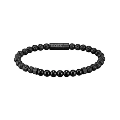 Beaded bracelet for men by Boss jewelry Material: 24 lava stones beads mixed with seven precious onyx stones separated by two rondelle beads embellished with a knurl texture Inner circumference: 19 cm Embellished with Etched Boss jewelry logo on the closure Closure: Magnetic