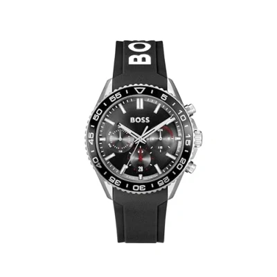 Dynamic Chronograph Precision: Take your timekeeping to the next level with the dynamic precision of a chronograph movement, enabling you to track elapsed time with both style and unwavering accuracy. CASE DIAMETER: 44 MM ; THICKNESS: 11.45 MM – A bold silhouette with rotating bezel and strong angles, crafted for everyday performance with sport-inspired edge. Sleek Black Circular Brushed Dial: Immerse yourself in sophistication with the sleek black circular brushed dial of this timepiece. The CD cut sub-eyes add a touch of precision and style, enhancing both the aesthetics and functionality of the watch. Bold BOSS Logo on Black Silicone Integrated Bracelet: Make a statement with this watch, showcasing a black silicone integrated bracelet adorned with a prominent BOSS logo. The fusion of comfort and style creates a timepiece that stands out, offering a contemporary and confident wristwear experience. Water Resistance: 5ATM It may be worn while showering or swimming, but not scuba diving
