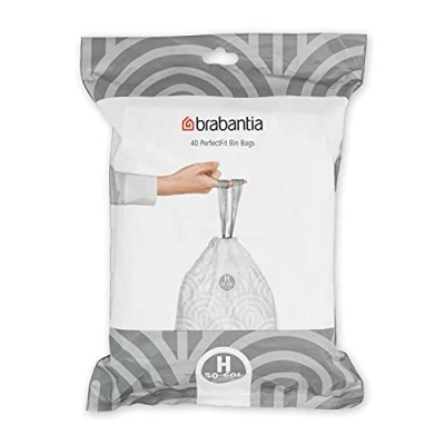 Brabantia 138744 PerfectFit Bin Liners (Size H/50 60 Litre) Thick Plastic Trash Bags with Tie Tape Drawstring Handles (40 Bags), White, Pack of 1
