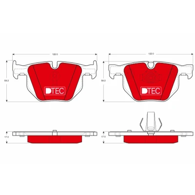 Brake system: dust-reduced brake pads; also for perforated brake discs Thickness: 17 mm Manufacturer Restriction: ATE Height 1 [mm]: 59.2 Height 2 [mm]: 58.2 Length: 122.0 mm Certification: E9-90R-02A1148/3105 Wear warning contact: prepared for wear warning indicator