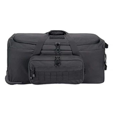 Robust and spacious travel bag Divided main compartment, inner pockets, various outer pockets, Molle system on the front pocket Robust plastic castors - base construction made of hardened plastics - fibre composite plastic in the base Padded sturdy carrying straps - trolley system Separable front pocket with MOLLE - Velcro surface for patches - side carrying handles - all-round padding - 3 robust plastic wheels