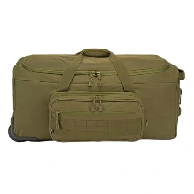 Robust and spacious travel bag Divided main compartment, inner pockets, various outer pockets, Molle system on the front pocket Robust plastic castors - base construction made of hardened plastics - fibre composite plastic in the base Padded sturdy carrying straps - trolley system Separable front pocket with MOLLE - Velcro surface for patches - side carrying handles - all-round padding - 3 robust plastic wheels