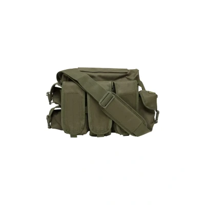 600D polyester multifunction bag 1 large main compartment, practical quick access via pocket lid, Velcro closure 3 front pockets with Velcro closure 3 small side pockets with Velcro closure and additional clip closure Adjustable length shoulder strap with padded shoulder rest, MOLLE system, adjustable compression belt