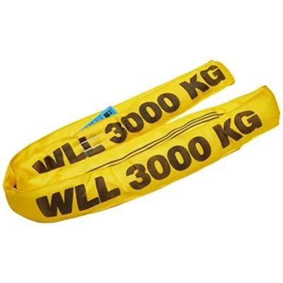 Round sling 3000 kg load capacity directly in 2.0 metres circumference, 1.0 metre effective length Single jacket hose made of 100% polyester with stretchable polyester core Colour yellow with 3 black stripes characteristic Tube width 57 mm