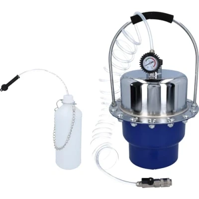 Compressed air bleeding of brake and clutch system Brake fluid and compressed air are separated by a membrane Working pressure can be adjusted from 0 - 3 bar via pressure regulator and can be read on the pressure gauge Quick coupling on the filling hose for easy installation of the adapter 5 litre brake fluid reservoir, connection hose with quick coupling (length 6 metres)
