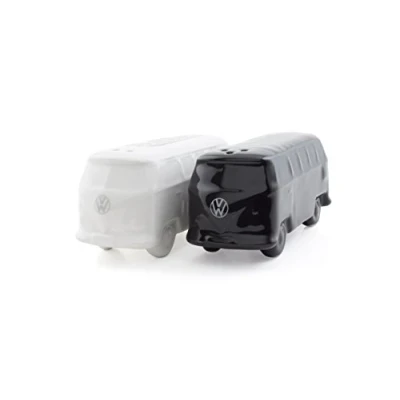 CLASSIC Bus/WHITE & BLACK: The iconic salt and pepper shakers are color-coordinated. The openings for sprinkling are located on the roof. Dimensions per Bus: 10.2 x 4.7 x 4 cm (4 x 1.9 x 1.6 inches). Scale: 1:22. PRACTICAL Details: Our 3D spice shakers have been lovingly adorned with the inscriptions "SaltBus" and "PepperBus" on the roof of the VW T1 Buses, making them easy to tell apart. ATTRACTIVE ACCESSORIES: These iconic salt and pepper shakers bring a special flair of elegance and individuality to the dining table. They are a true delight for any VW fan when it comes to seasoning dishes. MATERIAL: Made from corrosion-resistant ceramic, these shakers exhibit high dimensional stability and hardness. The set of 2 comes in an elegant gift box. OFFICIALLY LICENSED: The practical salt and pepper shaker set in the VW T1 Bus design is an officially licensed Volkswagen product. All our items are developed in Germany to meet our high-quality standards.