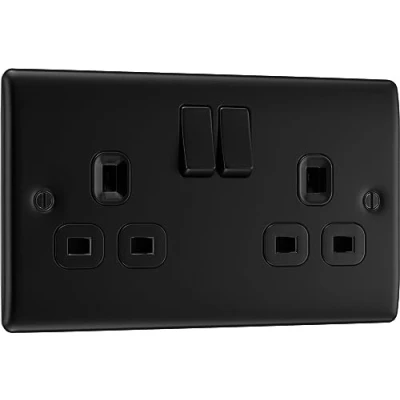SLEEK AND SLIM MATT BLACK DOUBLE SWITCHED POWER SOCKET: With double pole switching for peace of mind and safer installation PART OF THE NEXUS METAL RANGE: From BG Electrical, has softly rounded corners, and a slim profile – combining quality with modern elegance ANGLED IN-LINE COLOUR CODED CAPTIVE SCREW TERMINALS: Makes it incredibly easy to install and to connect the wires. Fits a 25mm back box, ideal for retrofit FIXED INTEGRATED PLASTIC GASKET TO PROTECT METAL EDGES FROM MOISTURE: With no visible plastic to be seen around the switches BG ELECTRICAL 25 YEARS MANUFACTURER'S WARRANTY: They guarantee against faulty materials and workmanship for 25 years – giving you total peace of mind