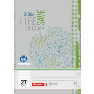 Brunnen recycling exercise book, DIN A4, 16 pages (simple booklet), 1 piece 80 g/m² writing paper made from 100% recycled paper Line style 27, lined, with margin line inside and outside Recycled paper extra white, climate-neutral production (without water pollution, bleaching and colouring) With large labelling area on the front