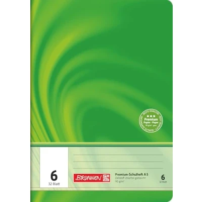 Brunnen Premium exercise book DIN A5, 32 sheets (double book), 1 piece Ink-proof 90 g/m² writing paper for high writing comfort Line style 6, unlined, with line sheet Awarded the FSC environmental seal With large labelling field on the front; contents overview and class mirror inside; rounded corners; extra strong glossy envelope
