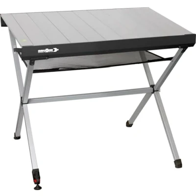 Aluminium table with roller top and special easy to assemble folding frame. Rolling table top with silver anodised slats (gapless system) Very sturdy aluminium square tube frame and central stabilising bar. With practical mesh shelf and transport bag (100% polyester) with 2 separate compartments Type of camping table: rolling table, height adjustable: yes, with carry bag: yes, mesh shelf: yes, load capacity: 30 kg, table height: 72 (-3) cm, colour: silver Weight: 7.1 kg, pack size (L x W x H): 122 x 18 x 17 cm, table surface (L x W): 122 x 76 cm, frame material: aluminium, tube details square tubes: 25 x 25 cm