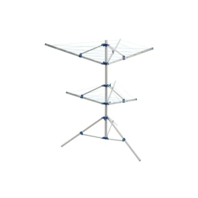 Clothes airer with folding rack Made of anodised aluminium Total length of the rope: 14 metres Packable in a bag Equipped with an extension