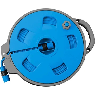 Hose reel with flexible and torsion-resistant flat hose The hose is made of food-safe 3-chamber hose Complete with 15m hose that can only be rolled out to the required length without clogging Complete with quick couplings and lance Ideal for washing vehicles, watering flowers and filling canisters