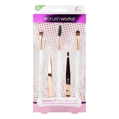 Set of 5 Premium Tweezers & Brushes for Perfect Brows Includes 2 Brow Brushes, 2 Tweezers & 1 Brow Comb Suitable for Liquid & Powder High Quality hand-crafted stainless steel Cruelty-Free & Vegan-Friendly