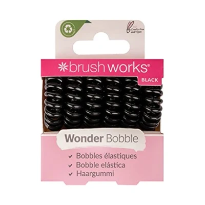 No Crinkle Hair Bobbles by Brushworks Set of 6 Medium sized black hair bobbles Vegan & Cruelty free Soak in warm water to contract to original size after use Perfect for all hair types