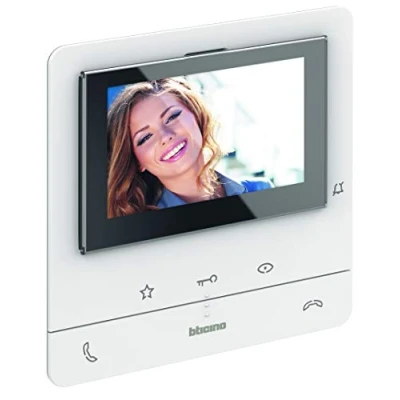 Hands-free 5-inch / 12.7 cm colour LCD display house station / interior for 2-wire technology, suitable for wall or table mounting (table accessories sold separately). In addition to the 3 sensor buttons for door open, answer conversation, staircase light on (activator item 346210) and door station on/off switch, 2 conversations and 4 freely configurable buttons. Choose from 16 melodic ring tones. Distinguish between door and floor call with call differentiation by 2 different melodies, control the volume with the help of the rotary knob. Volume of call tone and conversation as well as colour and brightness of the screen are set via the OSD menu, which is operated via a side control. LED indicator for: Call sound shutdown, door opening and connection status | Dimensions W × H × D: 164 x 165 x 18.5 mm.