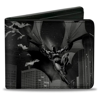 Buckle-Down Bifold Wallet Batman This awesome men's bi-fold wallet is made from premium vegan leather It measures 4.0x3.5x0.5 inches, and features the standard billfold, 5 card slots, and windowed id holder The gorgeous artwork is applied using the latest printing technology, so it will still look great after years of use This product is handcrafted in the USA by Buckle-Down and is officially licensed by dc Comics
