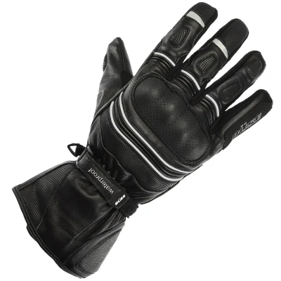 BÜSE Willow touring glove black / white ladies Features: waterproof, windproof and breatheable additional padding at palm elastic inserts Visor wiper Superfabric® sander on the palm Touch-screen-function Safety: hard shell over the knuckles leather doubling Velcro fasteners reflective elements Material: high quality cowhide Amara reinforcement on palm Porelle® climate membrane Outer Material: 100% cowhide Lining: 100% Polyester Additional Fabric: Amara: 60% polyamide, 40% polyester