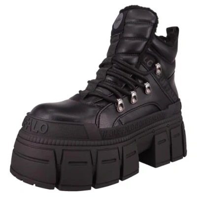 Crafted with black nappa faux leather for bold and stylish look, chunky high-profile sole for added height. Durable metal hook eyelets and secure lacing for a rugged finish, soft memory foam insole for all-day comfort. Brand: Buffalo, available sizes UK 3-7, black color, women's department, synthetic upper, lace-up closure Vegan-friendly, suitable for casual occasions in autumn/winter, ankle bootie style, synthetic lining and outsole.