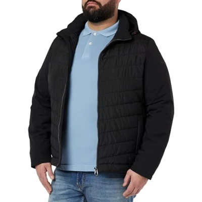 Hybrid jacket with slanted quilted look from the front to the back. Sleeves, sides and stand-up collar as well as the straight pockets are made from an unquilted nylon item. A detachable hood and the dark reflector accents on the front edge and side pockets. The jacket is fully lined and has colour accents in the front parts. The main item with stretch function impresses with its waterproof properties due to a 3000 mm hydrostatic head (3000 mmH2O) and is also PFC free. casual