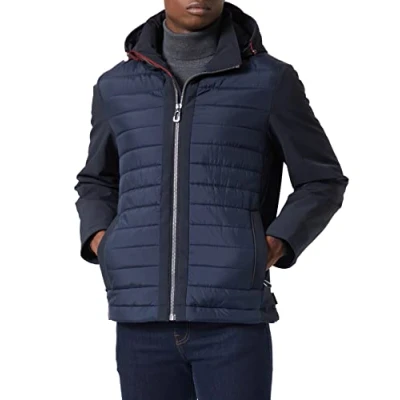 Elasticated hybrid quilted jacket with stand-up collar With removable hood and concealed knitted cuffs on the sleeve hem With two side zip pockets and two inside pockets The lining has elastic inserts in the back The blouson makes the material mix particularly sporty