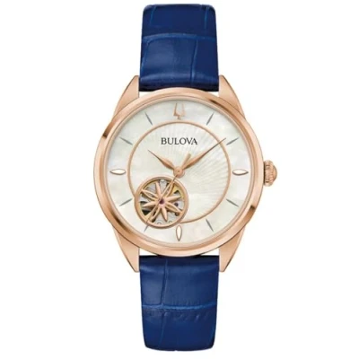 Unmatched in sophistication and timeless in design, this Bulova women's watch presents a new automatic watch from the Sutton collection that takes your style to a new level. High quality blue leather strap, 19 cm long and 15 mm wide, with a pin buckle. Case diameter: 34 mm, case height: 11 mm, case colour: rose gold, dial colour: mother of pearl Waterproof: 3 bars -Weight: 45g The watch comes in an original gift box and has a 2 year warranty