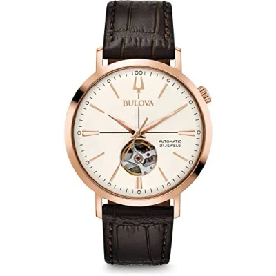 Bulova is renowned for their legacy of industry innovations and a history of firsts, since 1875 This Classic Automatic timepiece features a rose gold-tone stainless steel case with the crown at two o'clock position Open aperture silver-white dial with rose gold-tone hands and markers and an exhibition case back Additional features include automatic heart-beat self-winding movement with 4-hour power reserve and a brown leather strap Automatic Movement 41mm Case Diameter 30m Water Resistant/splash Resistant