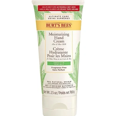 HAND CREAM FOR VERY DRY HANDS: Clinically shown to provide all daymoisture, this hand cream is specifically formulated to nourish and soothe dry, extremely dry and sensitive skin WITH SOOTHING ALOE & RICE MILK: Enriched with Aloe Vera, Rice Extract and Baobab Oil to help strengthen the skin barrier and help skin retain its moisture PROVEN RESULTS: A clinical study shown that after four weeks of use, the Burt's Bees Sensitive Skin Care line improved the skin’s moisture barrier by 20% FAST ABSORBING & FRAGRANCE-FREE: This fragrance-free hand moisturiser quickly absorbs into skin, leaving hands amazingly soft and smooth DERMATOLOGIST AND NATIONAL ECZEMA ASSOCIATION APPROVED: this 99% hand cream is dermatologist approved and accepted by the National Eczema Association