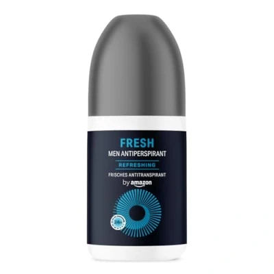 by Amazon Fresh Antiperspirant Roll-On for Men 1 x 75ml Fresh: extra dry sweat protection 24 hours: protection against odours 24/7 Directions for use: Apply to clean, dry skin of the armpits Vegan formula: contains no ingredients or by-products of animal origin. Dermatologically tested: suitable for all skin types Formula free from: alcohol, dyes, parabens, paraffins, mineral oils Warning: Do not use on irritated skin