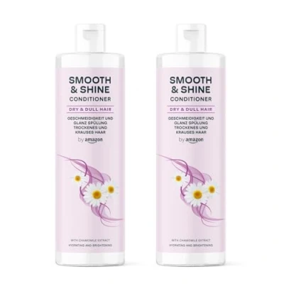 by Amazon Smooth and shiny conditioner, 2 x 300 ml Hair Type: For dry and brittle hair Moisturising and shiny: The conditioner for brittle hair with chamomile extract provides intensive moisture. Hair becomes smoother and shinier. How to use: Apply to wet hair after shampooing and stroke from the middle lengths into the ends. Make sure the hair is evenly covered. Leave on for 2-3 minutes, then rinse well. Vegan formula: contains no ingredients or by-products of animal origin. Dermatologically tested: suitable for all skin types Formula free from: silicone and microplastics