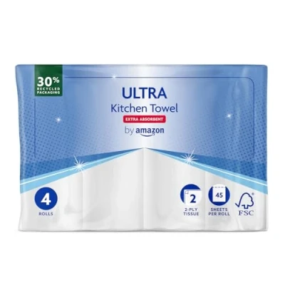 by Amazon ULTRA Kitchen Roll, Extra Absorbent, 4 Rolls (Pack of 1), 45 Sheets per Wring and Reuse, FSC Certified