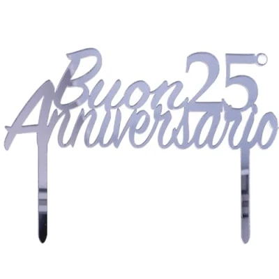Glittering plex cake topper with the words 'Happy 25th Anniversary', ideal for placing on your 25th wedding anniversary cake. The lettering is supported by two extensions that ensure easy attachment. Size: 6 Made from mirrored plexiglass Ideal for decorating your cake, Manufacturer: Graziano