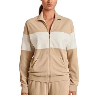 CALIDA Expands your loungewear selection with the jacket from the Lounge Desert series with another piece that belongs in every style-conscious wardrobe In addition to the soft velour fabric, which is experiencing a revival in 2023, the contrasting horizontal stripes in retro design are an eye-catcher The jacket is made from 39% cotton, 38% Tencel, modal, 23% polyamide Oeko-Tex certified Care instructions: wash at 30°C