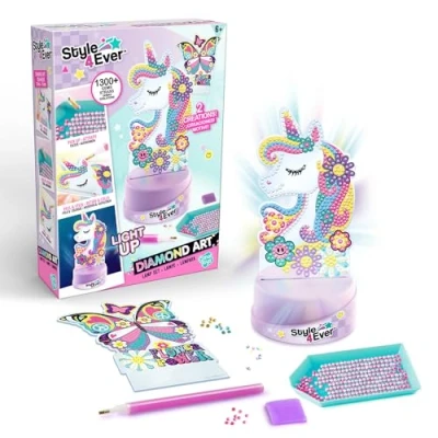 Fun and playful: a box with 2 figurines to decorate using the diamond painting technique, choose the unicorn or the butterfly, and apply the rhinestones one by one following the model, once finished, place it on the luminous base so that it will glow in the dark, a creative, fun and educational activity suitable for children from 6 years old Diamond technology: includes all the accessories necessary for the diamond painting technique: diamond pen, collection tray and wax square, place the rhinestones in the tray, apply wax to the end of the pen and remove and apply the rhinestones one by one Bedside Lamp: Soft White Children's Light, Multi-Color Mode, Requires 3 x AA / LR06 Batteries Not Included, On/Off Button CONTAINS: 1 light base, 2 unicorn and butterfly figurines to decorate, 1 rhinestone pencil, 1 rhinestone container, 1 eraser, 8 bags of rhinestones, Manufacturer: Canal Toys