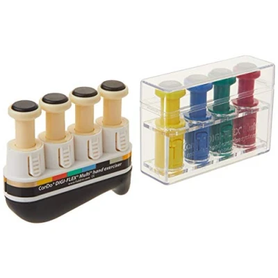 Hand exerciser that develops isolated finger strength, flexibility and coordination while strengthening your forearm muscles at the same time Ideal for therapy, rehabilitation, and also for your effective workout at home or at work Modular system: frames and interchangeable buttons; ergonomic palm bar for comfortable application Interchangeable buttons with 8 different challenge levels available: 0.34 kg/tan, 0.75 kg/yellow, 1.4 kg/red, 2.3 kg/green, 3.2 kg/blue, 4.1 kg/black, 5.0 kg/silver, 5.9 kg/gold wide product range: packs for clinical and personal needs, additional buttons, and boxes