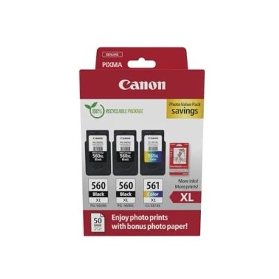 Canon PG 560XL x 2 / CL 561XL High Yield Genuine Ink Cartridges, Pack of 3 (2 Black, 1 Colour); Includes 50 sheets 4x6 Photo Paper Cardboard Multipack