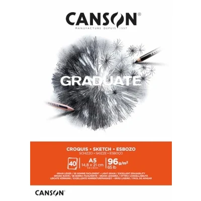 CANSON Graduate Light Grain 96gsm A5 Sketch Paper Pad, Glued Short Side, 40 Natural White Sheets, Ideal for Professional Artists & Students