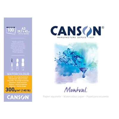 Canson Montval 300gsm watercolour practice paper pad including 100 sheets, size:A3, natural white and Cold Pressed (Not)