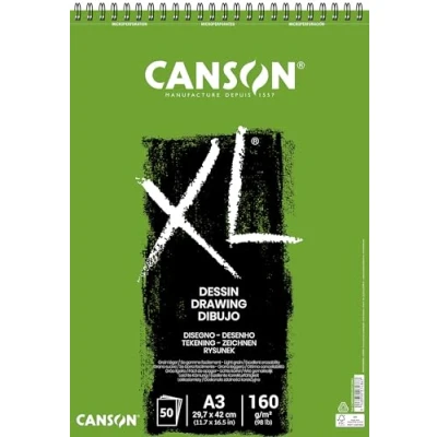 CANSON XL Drawing 160gsm A3 Paper, Light Grain, Spiral Pad Short Side, 50 White Sheets, Ideal for Professional Artists & Illustrators