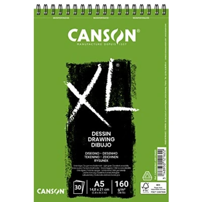 CANSON XL Drawing 160gsm A5 Paper, Light Grain, Spiral Pad Short Side, 30 White Sheets, Ideal for Professional Artists & Illustrators