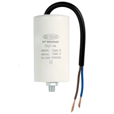 motor capacitor Capacity: 20uF / Tolerance: ±5% Operating voltage: 450 V Dimensions: diameter 40 x 71 mm Cable connection: 14 cm, attachment: M8